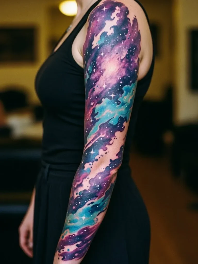 This watercolor sleeve stretches from the upper arm down to the wrist, filled with swirling galaxies and star clusters. Deep purples, blues, and hints of turquoise melt together with soft fades and tiny white star details, creating an airy space-like effect with no harsh borders. It is a large sleeve that feels immersive and dreamy.