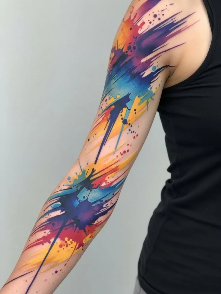 This abstract watercolor sleeve features sweeping brushstrokes in blue, yellow, purple, and coral layered across the arm. Ink splashes and dripping paint details give it an energetic, modern feel without any defined imagery. The colors follow the arm’s shape, creating a bold and artistic full sleeve.