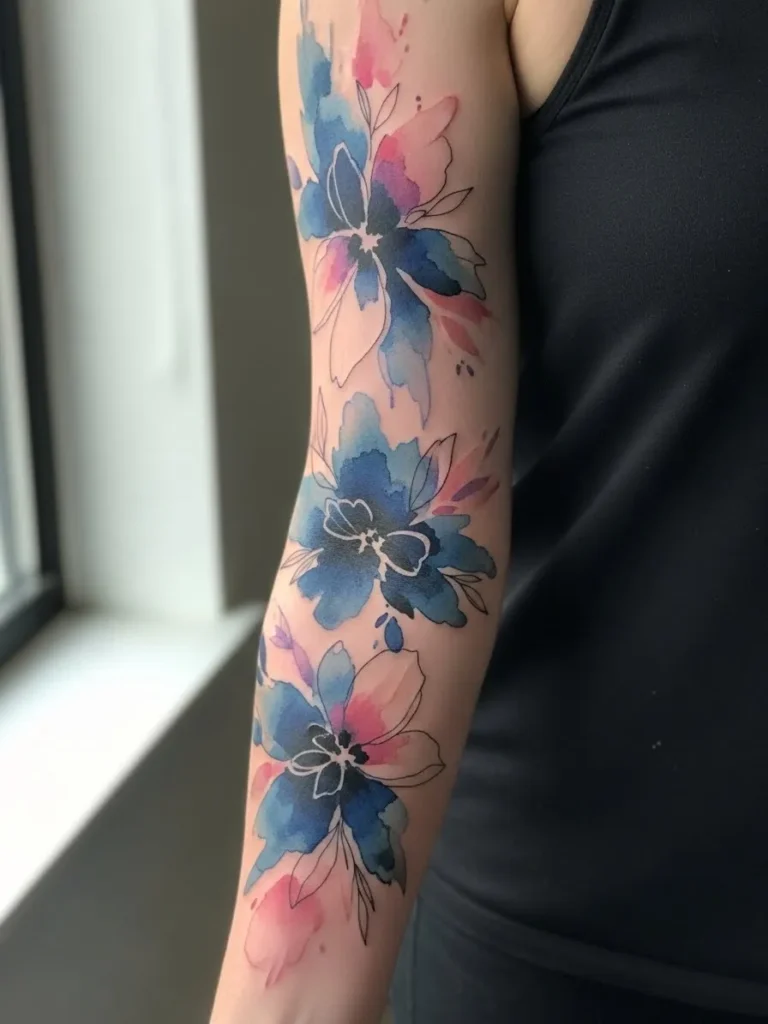 This watercolor sleeve features large flowers created with minimal linework and soft washes of blue, pink, and muted purple. The petals blend into the skin with light splashes and subtle drips, giving the sleeve a calm and airy appearance. It is a full sleeve that feels delicate and balanced.