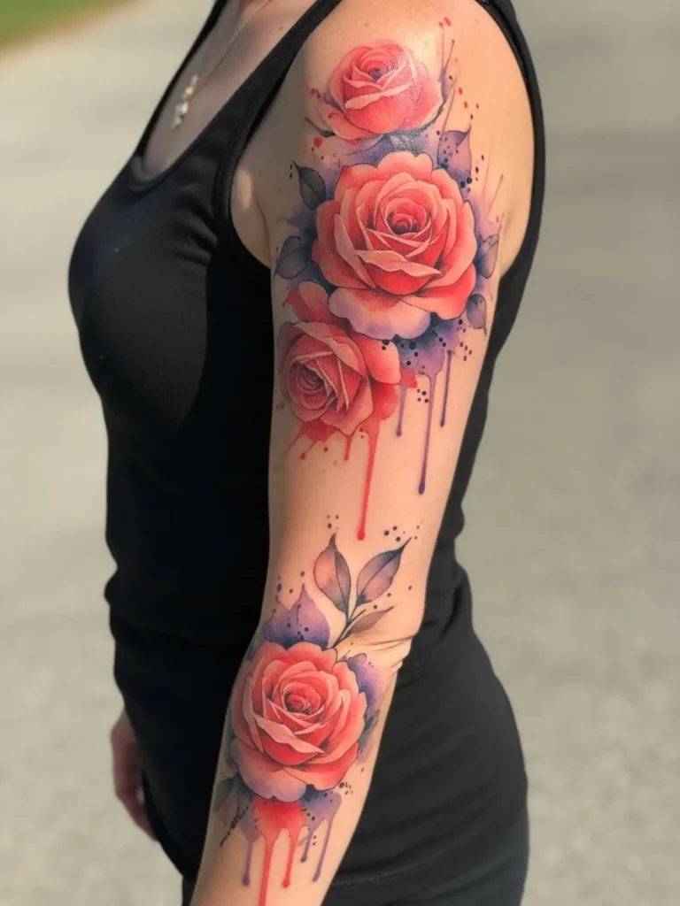This watercolor floral sleeve features multiple roses flowing from shoulder to forearm. Soft reds and pinks blend with muted purple shadows, delicate splatters, and ink drips that give the flowers a painted look while keeping the petals romantic and detailed. It is a medium to large sleeve that feels expressive and elegant.