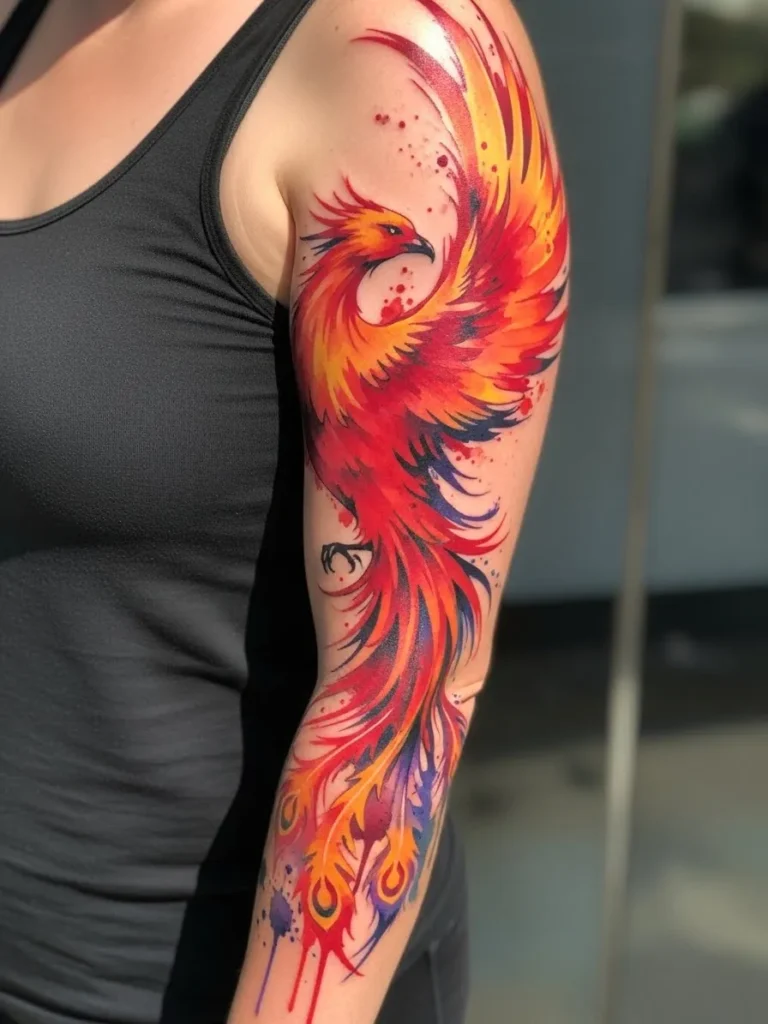 This bold watercolor sleeve features a phoenix rising along the upper arm and down toward the forearm. Fiery reds, oranges, and golden yellows blend with hints of deep blue, while sweeping wings follow the natural shape of the arm. The watercolor splashes add drama and motion, making it a powerful large-scale sleeve.