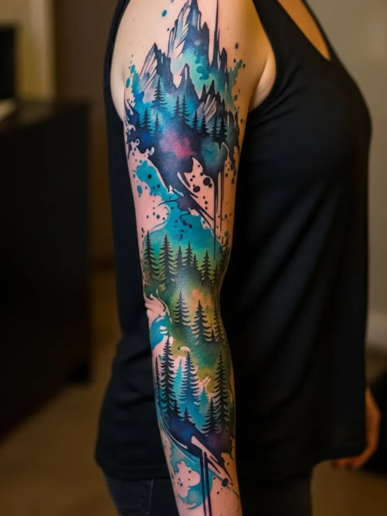 This watercolor sleeve showcases layered mountains, pine forests, and soft sky tones flowing down the arm. Cool blues and greens mix with misty purples and gentle splatter details, while tree silhouettes add contrast without losing the painterly feel. It is a full sleeve that feels balanced and serene.