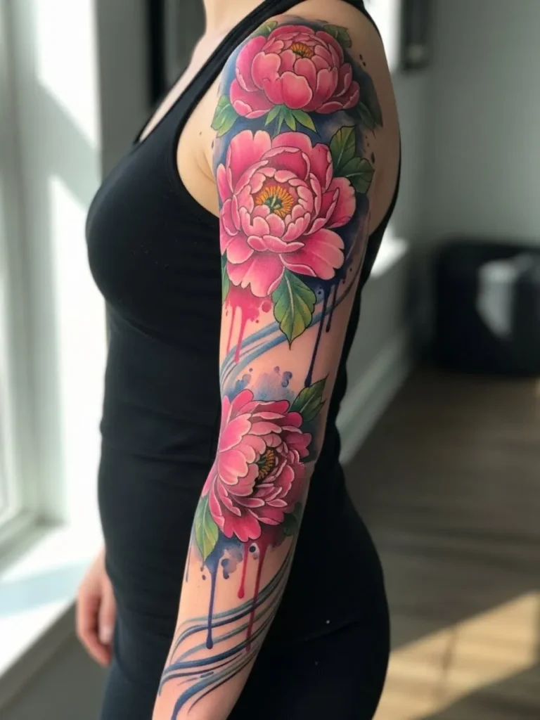 This watercolor sleeve features large peonies placed along the upper arm and forearm. Rich pinks, soft greens, and deep blue accents create a layered painterly look, while ink drips and loose brush strokes add movement and softness. It is a bold floral sleeve that still feels feminine and fluid.