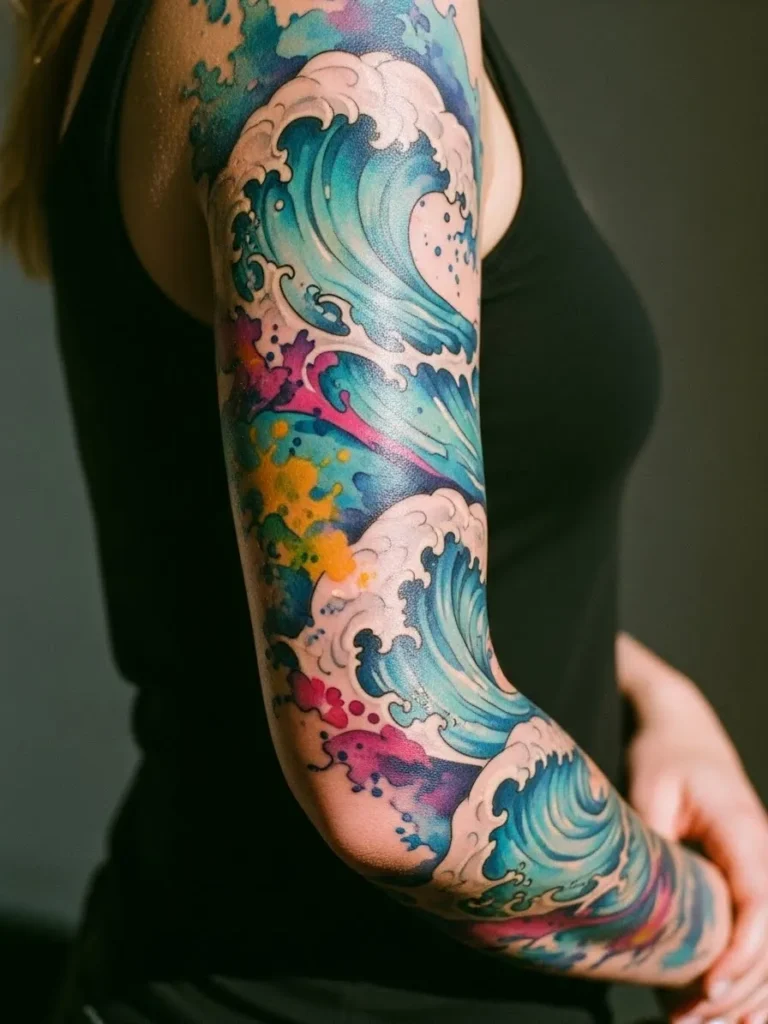This watercolor sleeve wraps the arm in powerful ocean waves inspired by traditional Japanese forms. Teal, blue, and white tones blend with splashes of pink and yellow, while the waves curve naturally with the arm to create depth and motion. It is a full sleeve that feels energetic and fluid.