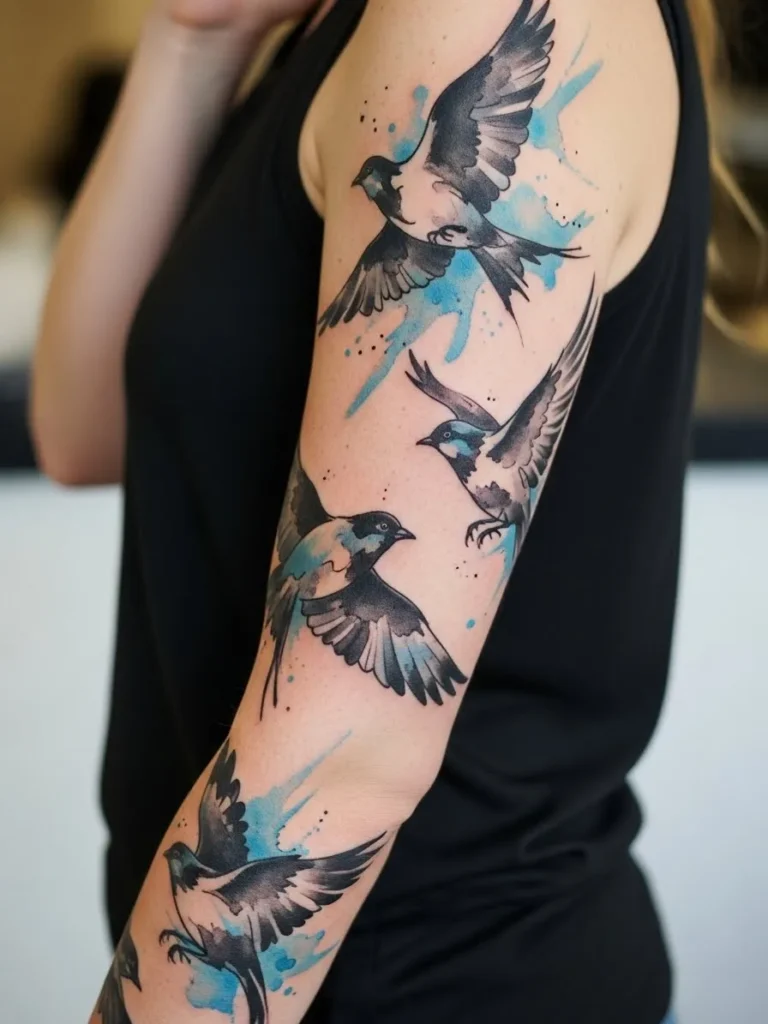 This watercolor sleeve features multiple swallows in mid flight placed along the upper arm and down toward the forearm. The birds are rendered in soft blacks and grays with gentle blue watercolor splashes behind them, giving the whole sleeve a light and airy feel. The placement follows the natural curve of the arm, creating a sense of movement and flow without overwhelming the skin.